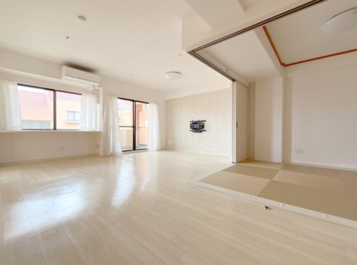 (1)全室フローリング・クロス貼替、(2)LDKにエコカラット・TV壁掛け金具設置、(3)キッチン(タッチレス水栓、食洗器、IHヒーター使用コンロ)新規交換、(4)トイレ新規交換、(5)浴室新規交換、(6)洗面化粧台新規交換、 (7)畳新規交換。