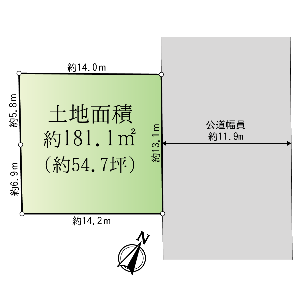 - 東側公道約11.9mに約13.1m接道